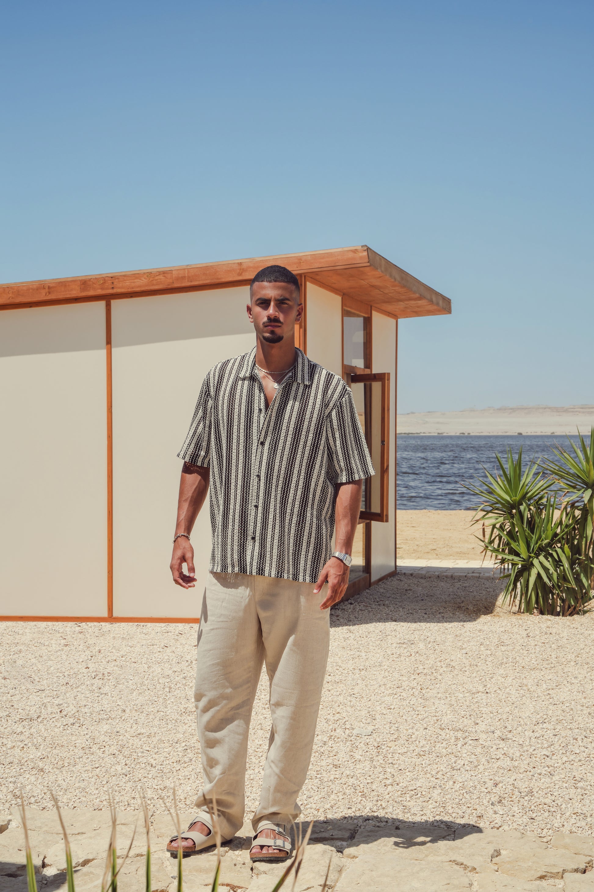 Crafted from an airy textured fabric, the Marquez Stripe Shirt balances structure and softness. It's black and ivory vertical stripes elongate the frame, while the open collar and lightweight weave bring effortless ease to warmer days. Designed for the modern gentleman who values comfort without compromising elegance.