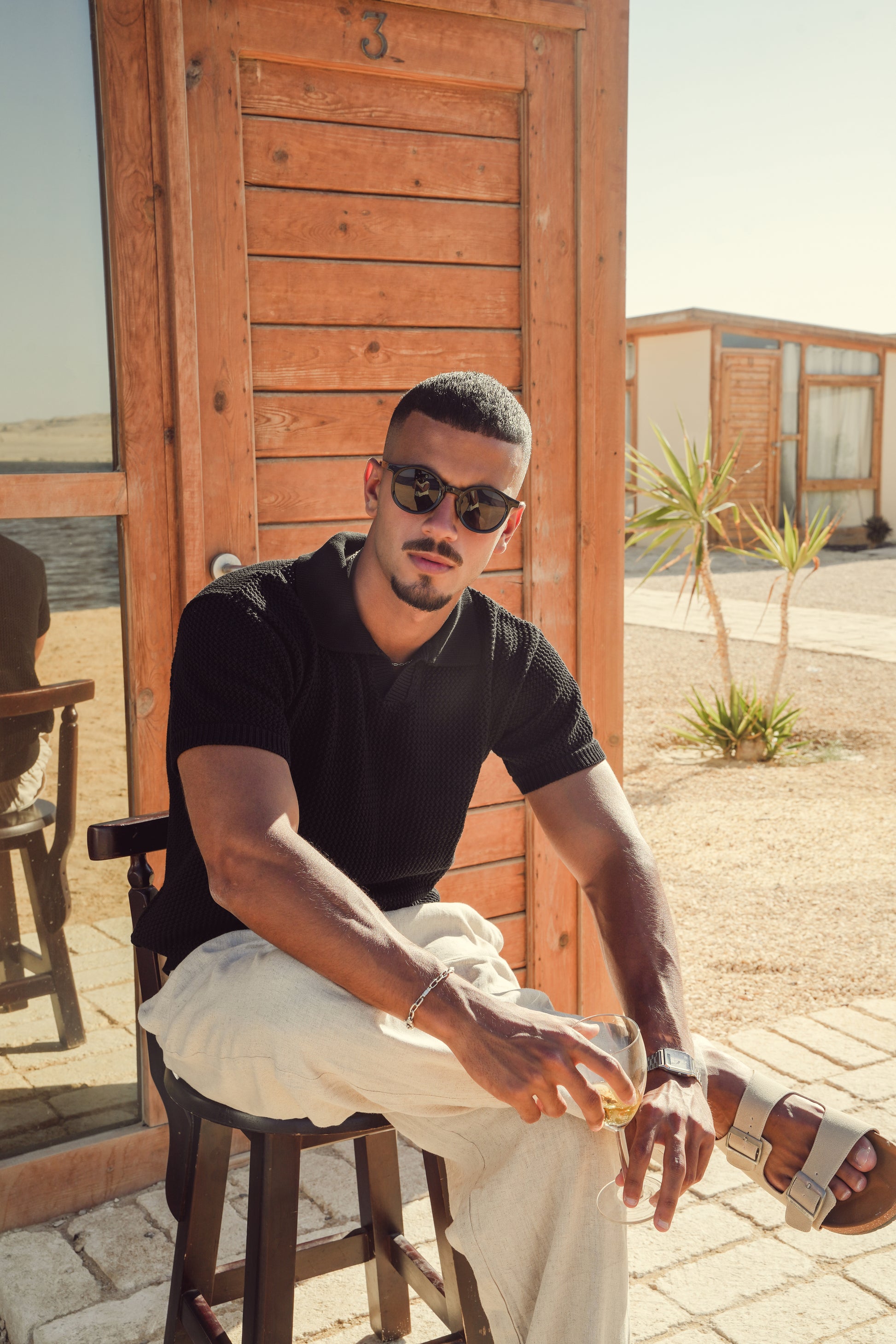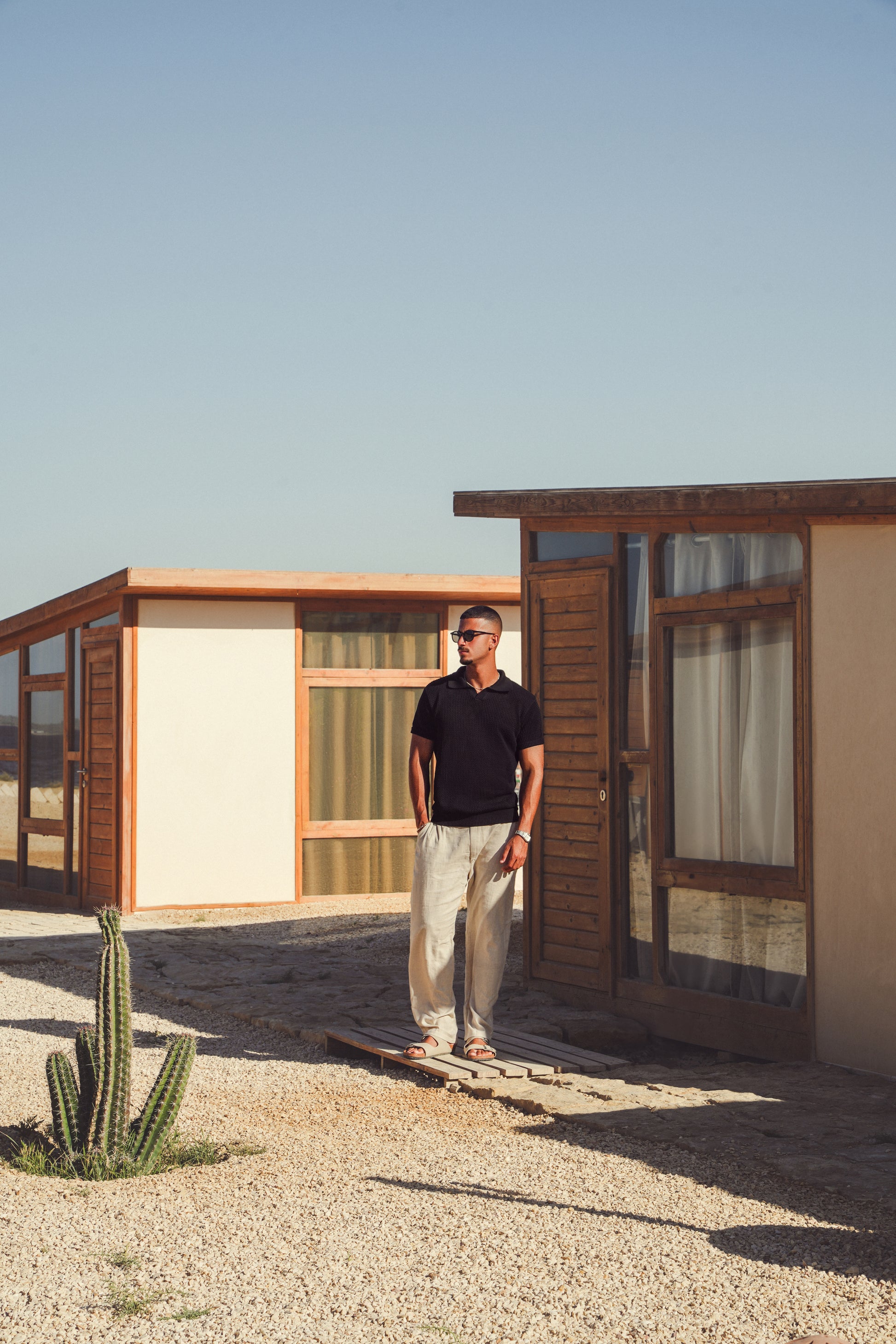 This open-weave knit polo brings a tactile richness to summer dressing. Designed with a crisp collar, soft hand-feel, and ribbed trims, it offers both breathability and structure. Whether paired with linen trousers for coastal evenings or styled solo during the day, it embodies the effortless charm of Mediterranean living.