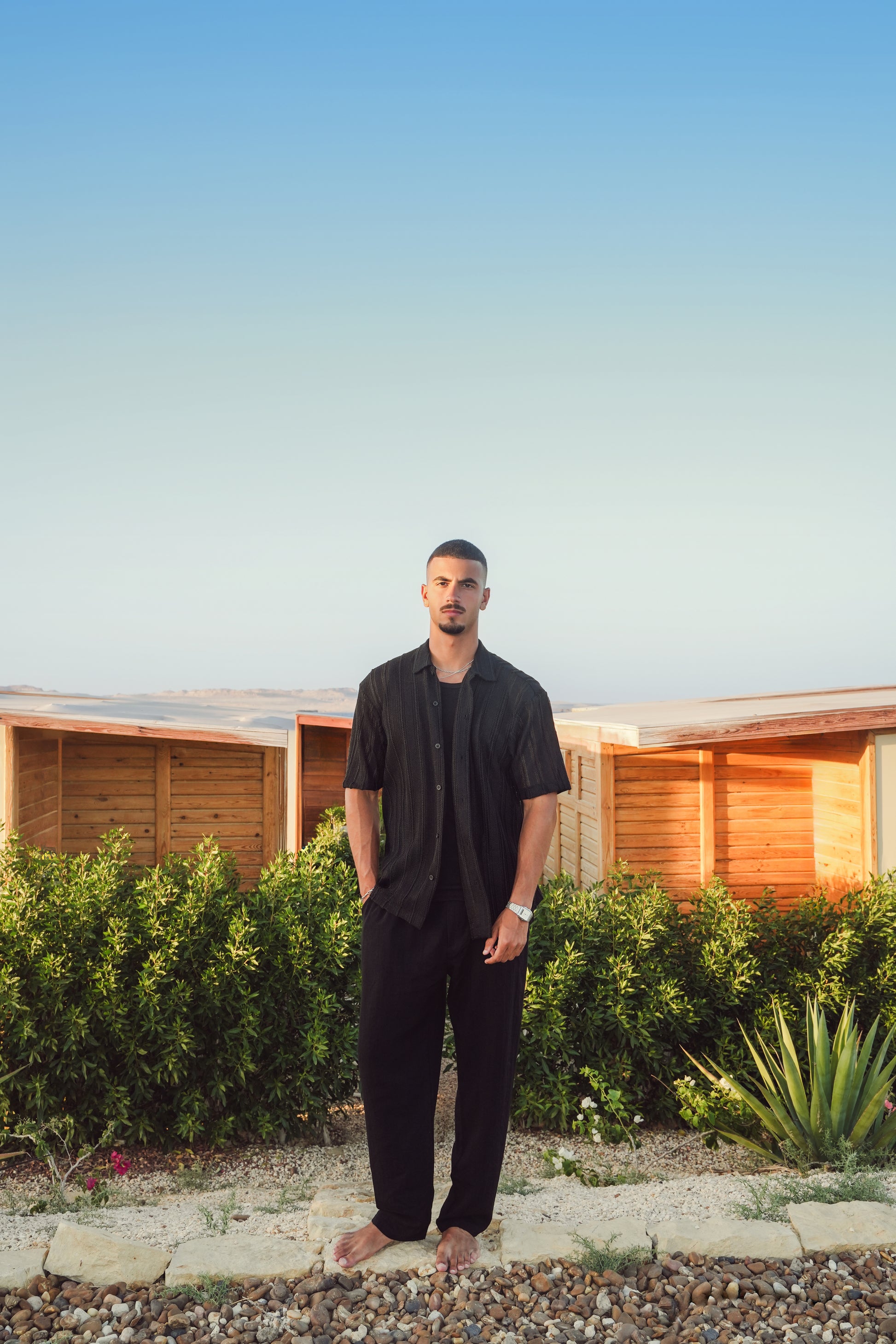 Effortless elegance in every thread. The Knitted Shirt is crafted from a breathable open-texture fabric that drapes naturally for a relaxed summer silhouette. Featuring a camp collar, tonal buttons, and subtle vertical patterning, this piece merges old-world charm with modern refinement. Perfect for sun-drenched days and balmy evenings, it’s your new staple for understated sophistication.